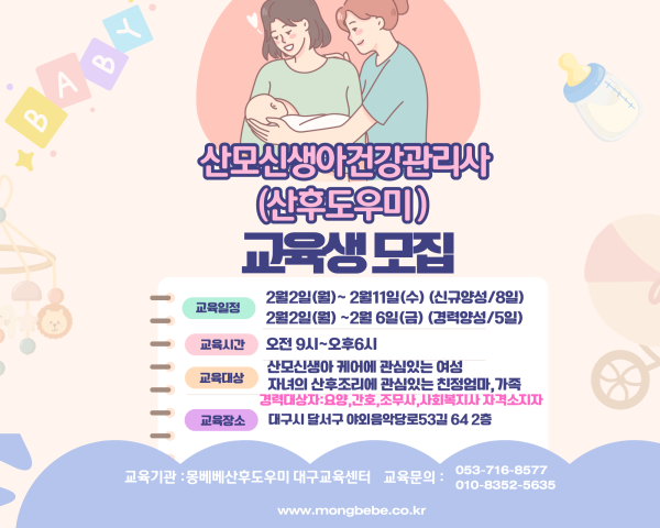 2026년 2월 산모신생아건강관리사 신규/경력 양성교육(취업 및 친정엄마/가족산후도우미교육)안내