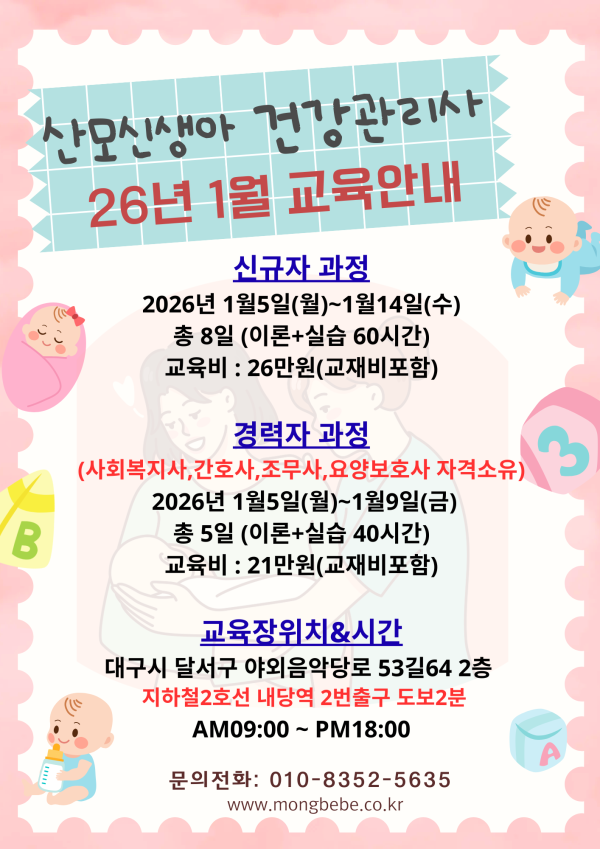 2026년 1월 산모신생아건강관리사 신규/경력 양성교육(친정엄마 및 가족교육포함) 안내